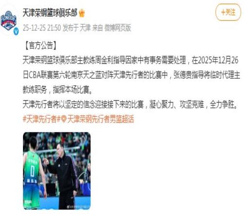 如今天津男篮官方公告显示:“天津荣钢篮球俱乐部主教练周金利指导因家中有事务需要处理,在2025年12月26日CBA联赛第六轮南京天之蓝对阵天津先行者的比赛中,张德贵指导将临时代理主教练职务,指挥本场比赛。天津先行者将以坚定的信念迎接接下来的比赛,凝心聚力、攻坚克难,全力争胜。”